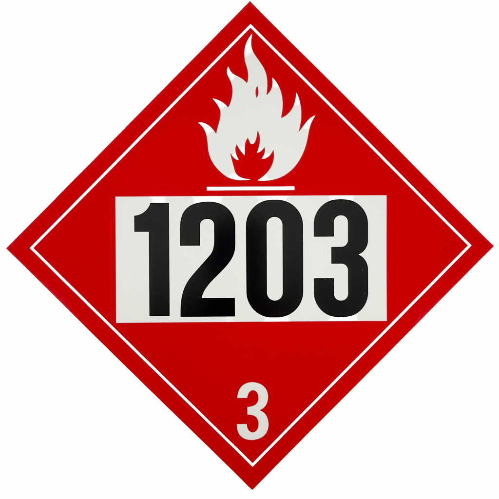 Placard Color & Symbol: Red background with black flame symbol; hazard class number “3” at bottom; “1203” displayed in the white space.