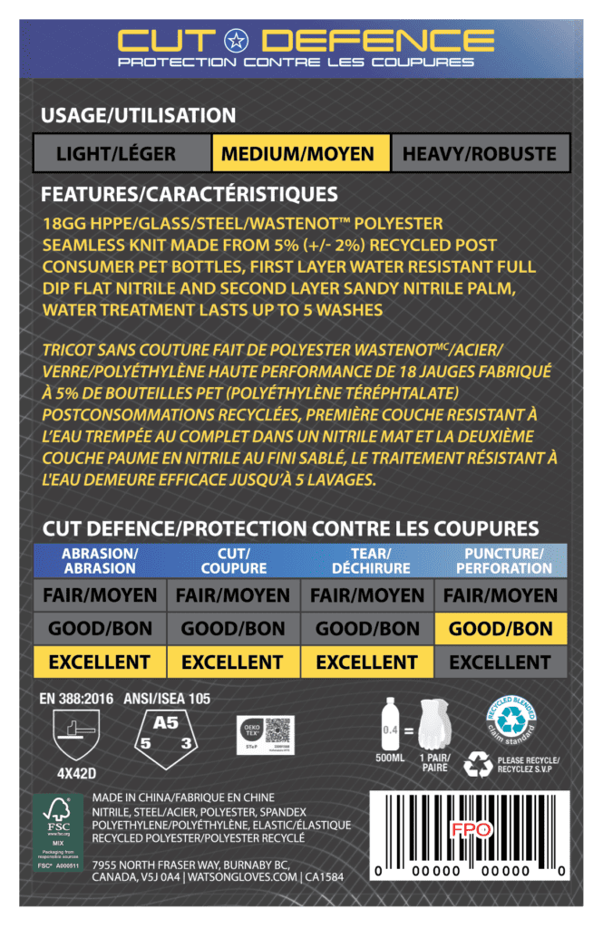 High-performance cut-resistant gloves featuring an 18-gauge HPPE/glass/steel seamless knit with WasteNot™ recycled polyester. A full flat-nitrile dip blocks liquids, while a sandy nitrile palm delivers confident grip in oily, wet, or dry conditions. OEKO-TEX® STANDARD 100 certified.